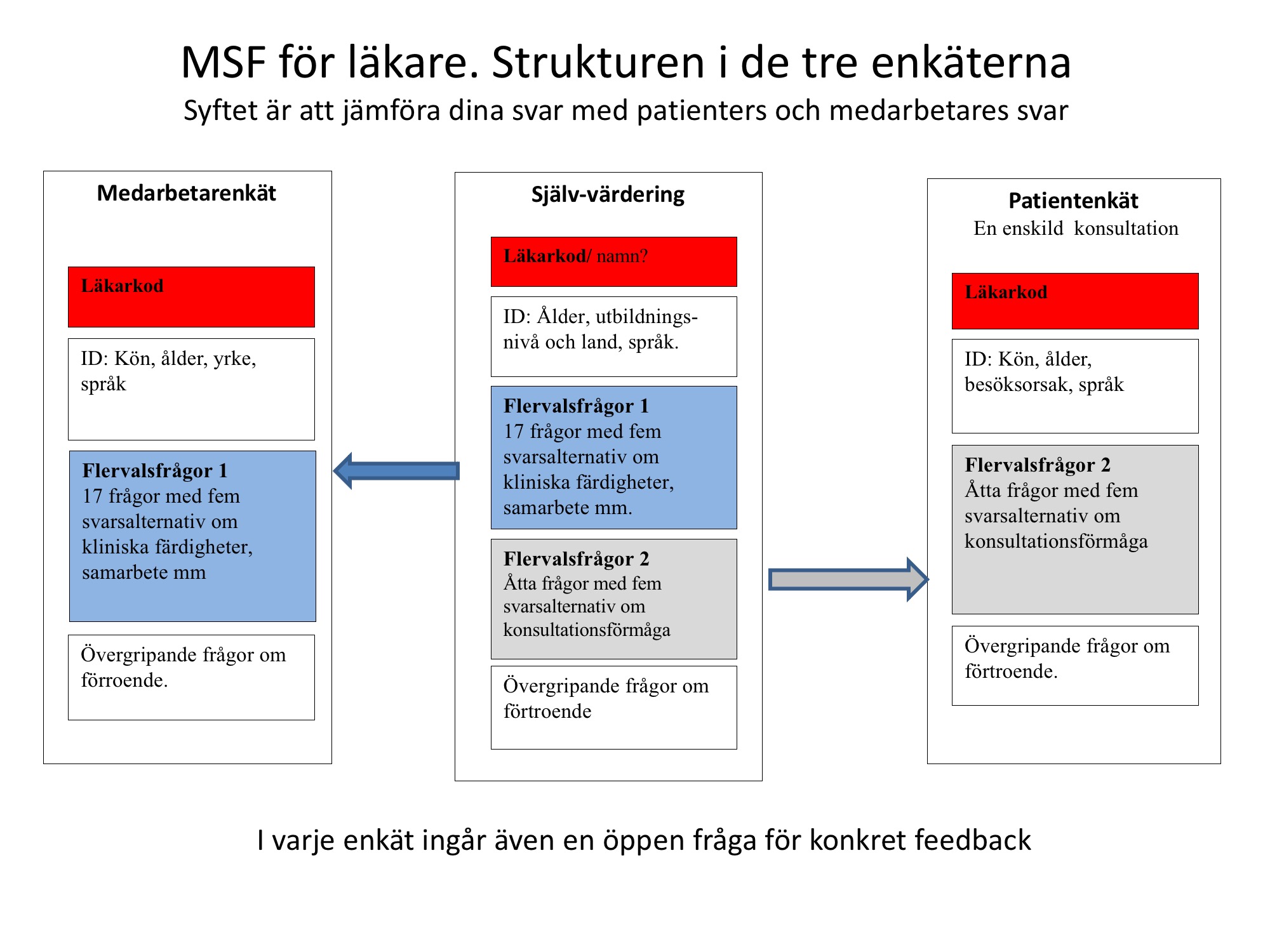 MSF för läkare är vår svenska validerade version av the General Medical Council Multisource Feedback Questionnaire, en internationellt erkänd 360 graders enkätmetod. Syftet är att ge dig en helhetsbild av hur ditt arbete uppfattas av både medarbetare och patienter med fokus på god allmänmedicinsk praktik som speglar Socialstyrelsens övergripande mål. Cirka 550 ST-läkare,och specialister över hela Sverige har de senaste fem åren fått anonym feedback i sin kompetensutveckling från grupper av medarbetare och patienter.